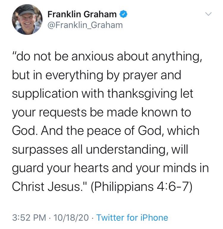 So this one can be a hard one to accomplish so the Bible says when I am afraid I put my trust in you and I know some things can be really scary especially to young children that you or them won’t have a strong faith and will have no other thing to do but to trust in God I know sometimes it’s storms that awaken my fear but it lies same for Prayer it’s something I’ve always been taught in time of worry turn your worries to prayer instead, faith over fear all these are strong reminders of turning you negative fears into positive faith yes it may be hard but the more we practice it the more we use it and easier it becomes so next time one of these happens to you remember the verse psalm 56:3 whenever I am afraid I will put my trust in you the more that you do this the more you start to see responses it also says in Philippians something similar as well as also in many other scriptures as well as Franklin Graham reminds us again today in his tweet